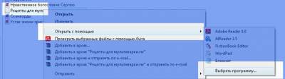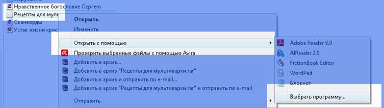 Чтобы открыть такую книгу на своём компьютере, в самом начале нужно задать, какой программой открывать книги FB2. Для этого выделим правой кнопкой мышки нужную книгу, в открывшемся меню нажмём левой кнопкой мышки на «Открыть с помощью», затем на «Выбрать программу…»