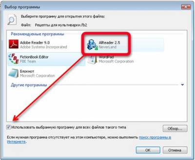 В открывшемся окошке «Выбор программы» выберем AlReader (программа уже должна быть установлена на компьютере), если этого значка не будет в окошке, ищем его, кликнув на строчку «Другие программы». Проверяем, стоит ли галочка в строке «Использовать выбранную программу для всех файлов такого типа», и жмём ОК. В дальнейшем книги FB2 будут открываться на компьютере без проблем.