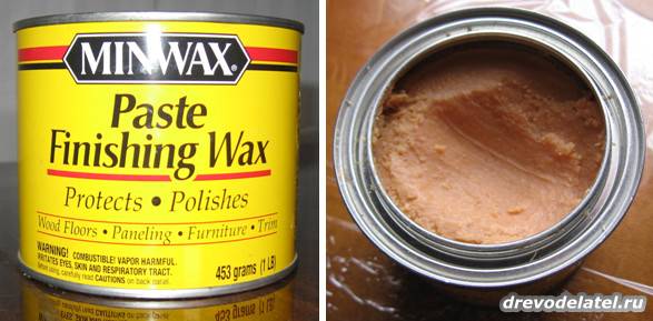 Для работы подходит: легко наносится; долго хранится; после нанесения воска и его располировки финишное покрытие изделия становится практически идеальным как внешне, так и по своим свойствам — приятнее на ощупь, устойчивее к загрязнениям; очень удобно избавляться от неизбежных в домашних условиях пылинок на финишном слое отделки — достаточно пройтись по пылинкам нулевой наждачной шкуркой и заполировать воском, и всё выглядит идеально.