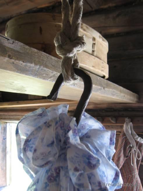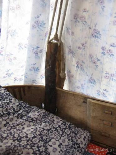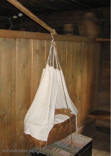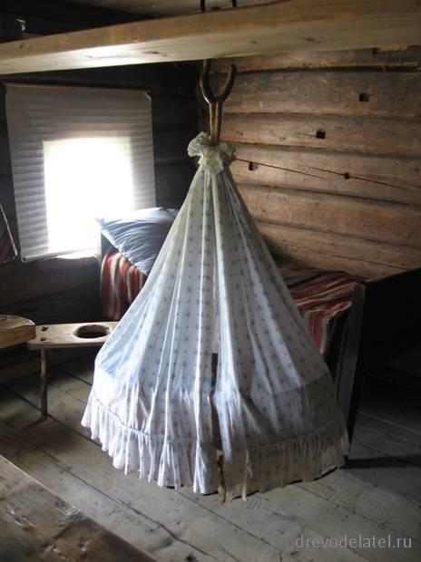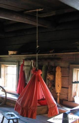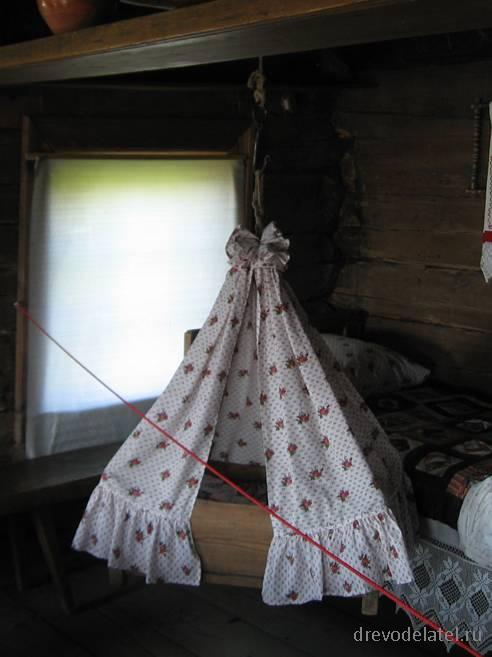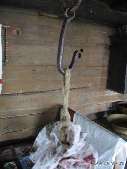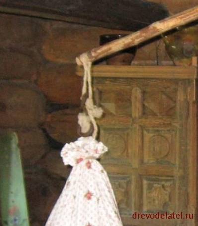 Здесь подвеска очепа решена очень просто и в то же время элегантно – в потолок вбито металлическое кольцо, в которое просовывается очеп. Опираясь задним концом об стену, и удерживаясь серединой ствола в кольце, очеп к тонкому концу с подвешенной за него колыбелькой создаёт эффект пружины, позволяющий люльке долго качаться от малейшего качания. Этот принцип подвески вполне можно применить и в современных квартирах ;-) Всего лишь придётся пожертвовать потолком и всадить в него аналогичное кольцо. А конец очепа замотать чем-то мягким, чтоб не корябал по потолку.