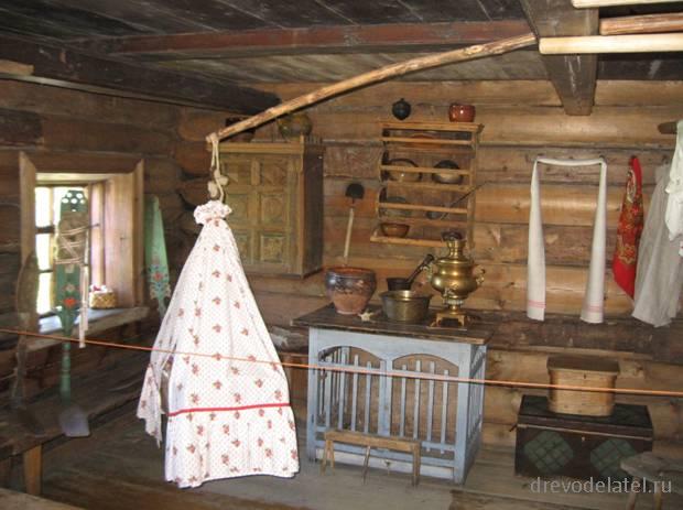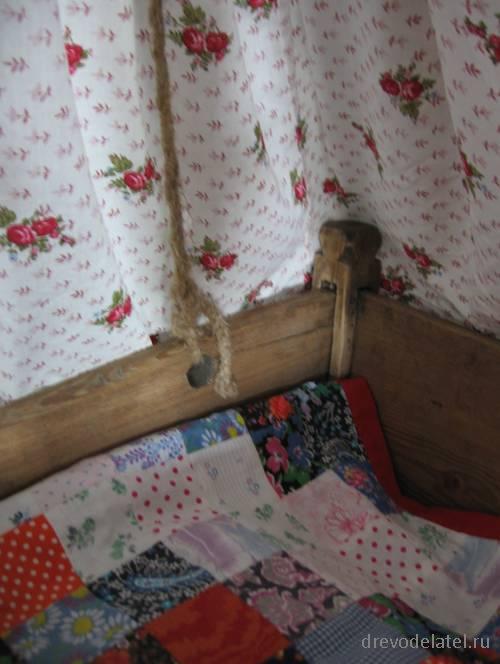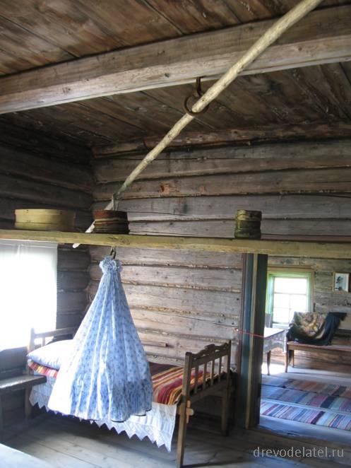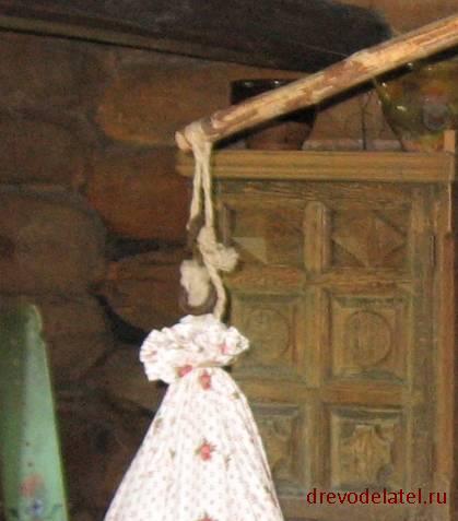 А вот здесь очеп традиционно просунут между полкой-воронцом и потолком. Но принцип тот же – задний конец опирается об стену, середина ствола удерживается опорой, тонкий конец с люлькой пружиняще висит в воздухе.