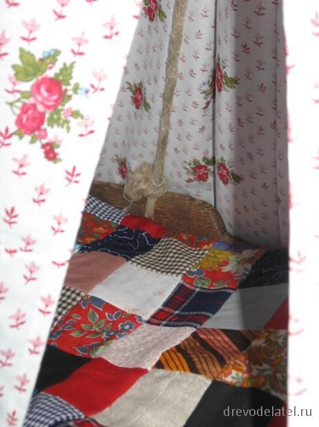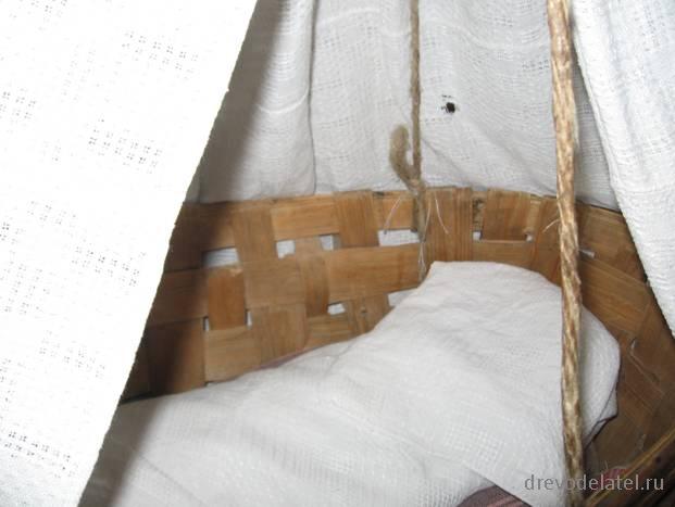 Все традиционные элементы конструкции уже узнаваемы ;-) Деревянный остов люльки, верёвки подвески завязаны в угловых отверстиях колыбельки и связаны единым узлом под S-образным крюком, который, в свою очередь, скреплён верёвкой с жердью-очепом.