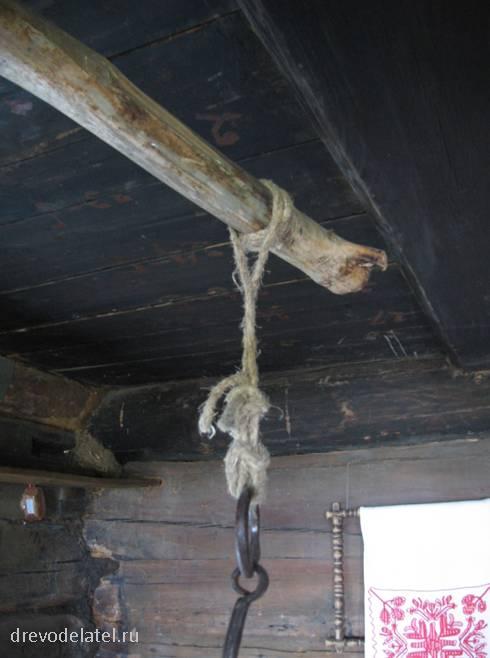 Здесь также очеп соединён с люлькой верёвкой, перевязанной вокруг тонкого конца очепа и завязанной узлом в колечке крюка.