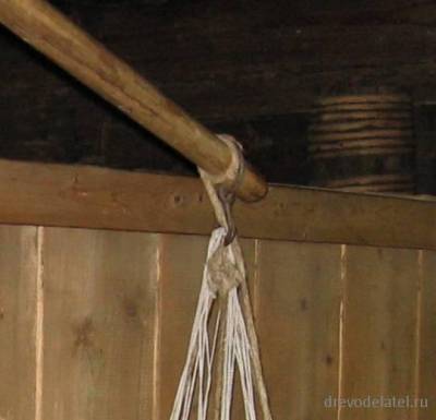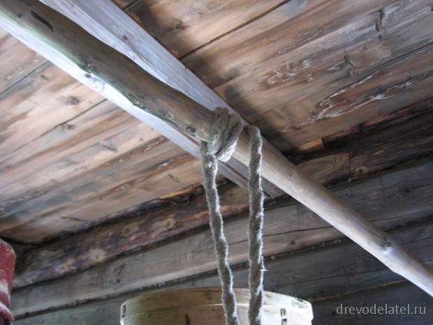 Этот же крюк скрепляет люльку с очепом. К верхнему концу крюка привязана узлом другая верёвка, которая просто перехватывает в несколько оборотов сам очеп.