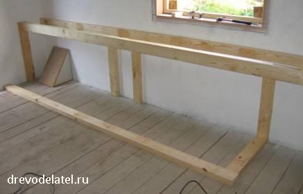 Подверстачье готово! К моему удивлению, конструкция оказалась очень прочной и монолитной, так что запланированные ранее для усиления каркаса косоуры между несущими брусами и стеной, а также уголки между брусами подстолья ставить не понадобилось.