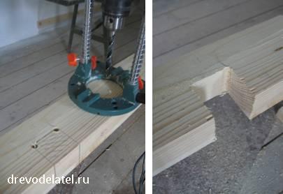 При сверлении отверстий их прямоугольность обеспечиваю направляющей для дрели. Кстати, сечение всех брусов у меня вышло 100х50мм, а ножек – 100х70мм.