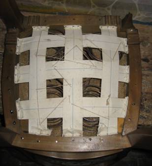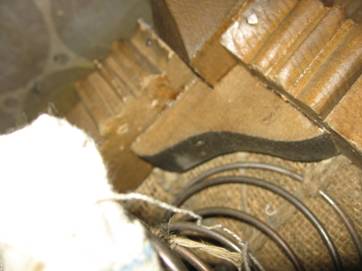 Под обивкой вижу ремни, которые в месте повреждения временно снимаю, чтобы не мешали.