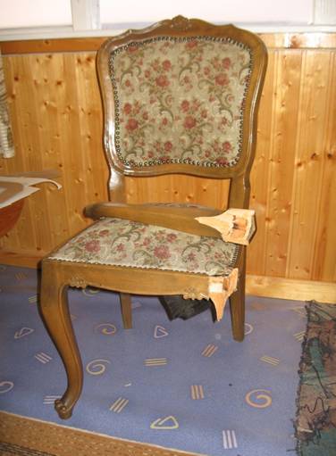 Отломилась ножка и, кажется, на нём уже никогда нельзя будет сидеть. Если у Вас нет инструментов, опыта и времени, то не трогайте стул, не пытайтесь склеить поломку попавшими под руку клеями — даже суперклей без определённых приёмов здесь не поможет, прихваченная им ножка отвалится при первой же попытке присесть на стул. Просто отдайте стул мастеру (например, мне :-)), чтобы он спокойно именно отремонтировал стул, не тратя времени на удаление и расчистку Ваших прежних попыток.