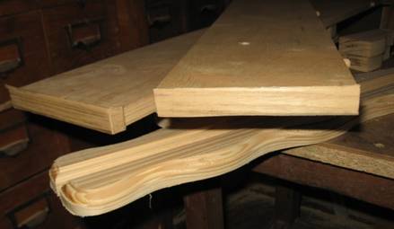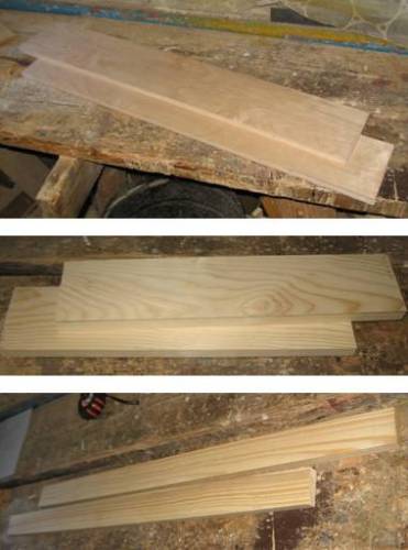 Материал для изделий я всегда подбираю наилучший — без прогнивших сучков, без смоляных кармашков. Если доски находятся идеально чистые, то, можно сказать, повезло — это высший сорт. Но чаще очень затруднительно при изготовлении изделий длиной от полуметра найти такие доски, и приходится брать их с сучками. Надо сказать, что здоровые сучки — вообще-то украшение древесины (в данном случае я пишу про сосну), они оживляют рисунок досок, и мне лично очень нравятся. Но мёртвые, чёрные сучки обязательно нужно удалять и заделывать.