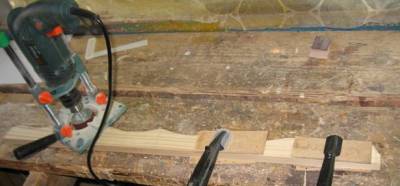 Далее я облагораживаю заготовки — торцы фанерных полок заклеиваю шпоном, кромки боковин и карнизов фрезерую,