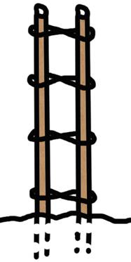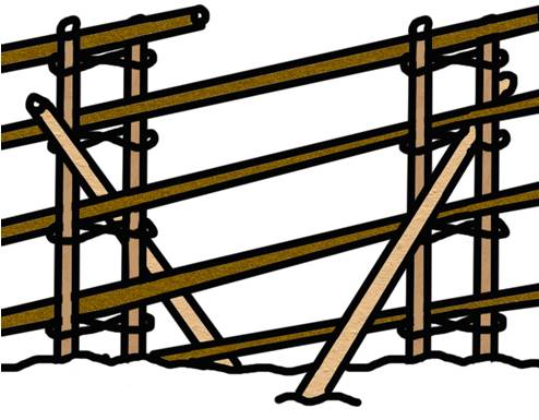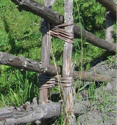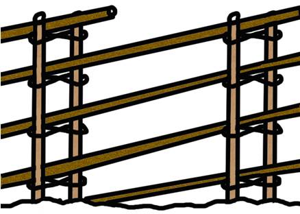 Затем в каждой паре делаются завязки из тонких гибких ветвей (в случае отсутствия ветвей их можно заменить шнуром или любой другой крепкой и долговечной верёвкой), по четыре завязки на пару жердей через каждые 15-20 см.