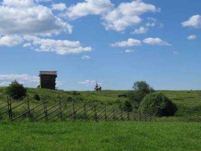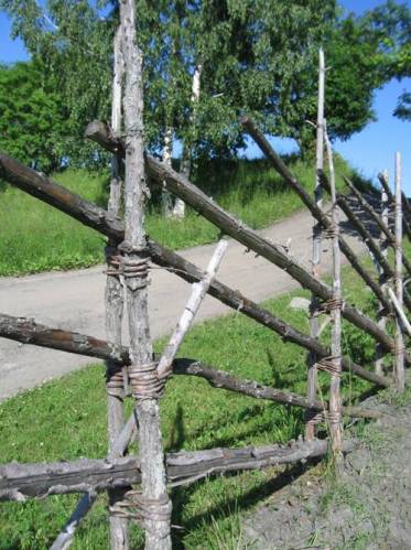Ограда по-кижски, которую я увидел во время пребывания в Кижах, не только проста в сооружении и практична в ограждении территории, но и очень декоративна — она неизменно притягивает к себе внимание своим ритмичным и при этом динамичным орнаментом повторяющихся косых линий жердей.