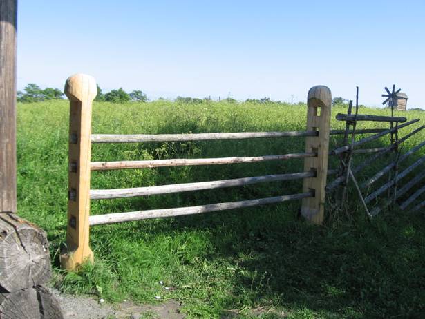 Затем столбы, предварительно обработанные против гниения, вкапываются в землю, и всё – ворота готовы! Остаётся только вставлять и вынимать по надобности горизонтальные жерди.
