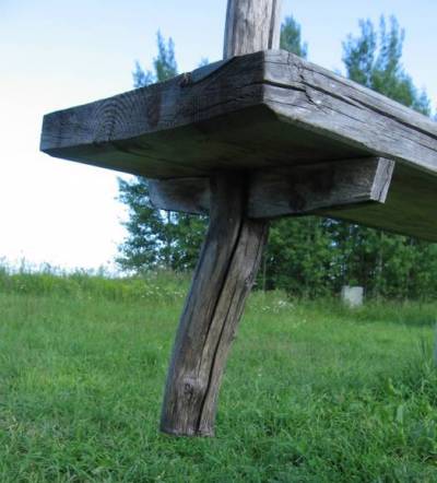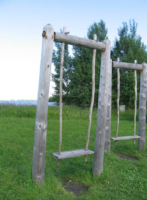 Вот такие качели я увидел в Кижах во время своего похода на Русский Север. И что меня поразило – качели полностью деревянные, без всяких металлических шарниров, подшипников и крепежа! Причём качаться на них вполне можно, и даже взрослому, только скрипят очень ;-)