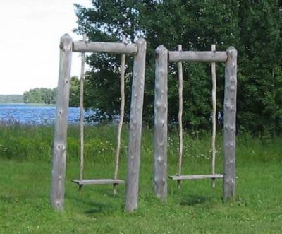 После изготовления и сборки на земле всей конструкции её вкапывают столбами в землю (разумеется, столбы должны быть заранее обработаны против гниения). Для облегчения установки качелей, я думаю, можно жерди с сиденьем вклинить после вкопки столбов, главное, вкапывать столбы вместе с верхним валом, чтобы не ушло расстояние, и всё было хорошо подогнано.