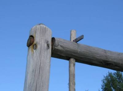 В верхних концах столбов высверливаются отверстия для круглых шипов заранее изготовленного вала. Отверстия должны быть чуть больше шипов, чтобы вал свободно вращался.