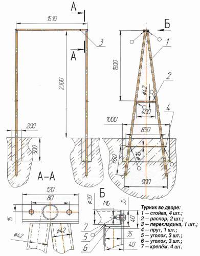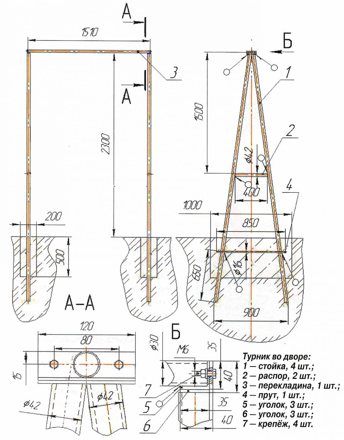 Для постройки турника пригодилось всё: и обрезки водопроводных труб 42 мм (стойки 1); и толстостенная труба 30 мм (перекладина 3); обрезки уголков 35x35 мм и 40x40 мм; куски арматуры 4.