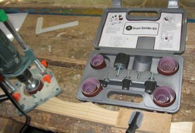 Шлифовальные барабаны зажимаются в дрель как свёрла, сама дрель вставляется в направляющую для дрели, и на выходе получается инструмент для быстрого шлифования криволинейных кромок.