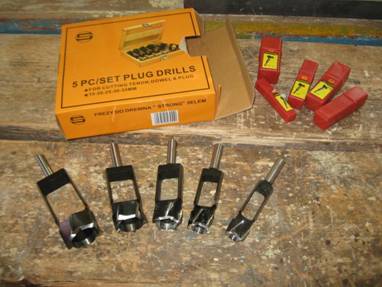 При всех его достоинствах, этот способ довольно медлителен. Ведь надо аккуратно изготовить вставку, под неё выбрать углубление. И вот недавно мне посчастливилось приобрести набор пробочных свёрел, позволяющих быстро и качественно заделывать сучки.