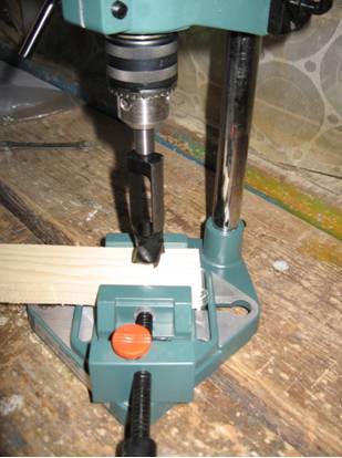 Сперва я подбираю заготовку под пробки, желательно из той же доски, что и деталь с сучком. Зажимаю эту заготовку в тиски стойки, пробочное сверло соответствующего диаметра уже заправлено в дрель.