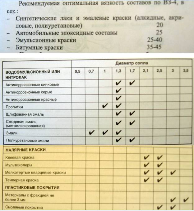 Также при подборе форсунок и вязкости ЛКМ нужно ориентироваться на приведённые в инструкциях сведения.