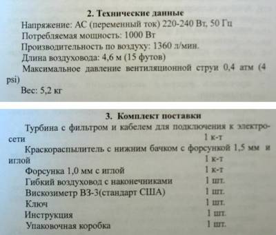 в комплект которого входит сама турбина, пластиковый пистолет с литровым бачком и соплами на 1 и 1,5мм, вискозиметр ВЗ-3, 4,6-метровый воздуховод, ключ и инструкция (подробнее технические параметры и комплектацию можно рассмотреть на фотографиях ниже);
