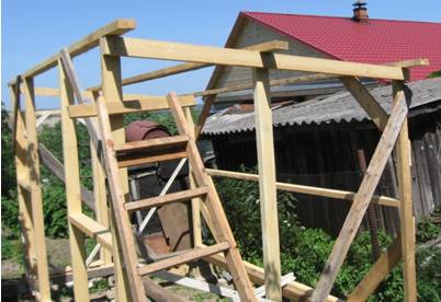 Далее мы наметили крышу, прибив верхние брусы-стропила, и торцевые стены, прибив боковые брусы-поперечины. Заодно прибили заранее изготовленную дверную коробку.