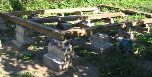 Фундамент мы решили делать в два этапа – сначала заливать цементный раствор в выкопанные в земле ямы, затем с помощью обечаек (деревянных форм, сколоченных из досок) нарастить тем же раствором до образования столбиков.