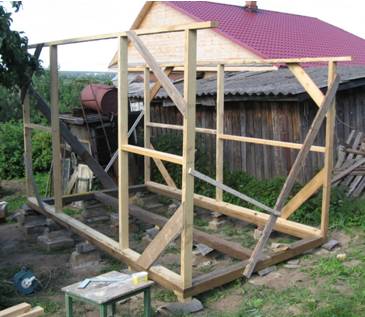 Собранные рамы-стены мы поставили на свои места и прибили к основанию. Чтобы стены не упали, мы временно укрепили их досками-косовинами.