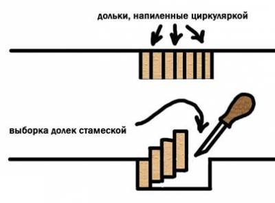 Пазы и шипы я выбирал просто – циркулярной ручной пилой, или, в просторечии, циркуляркой (такое уточнение к тому, что многие циркуляркой ещё называют пильный станок), с последующей выбивкой напиленных долек стамеской.