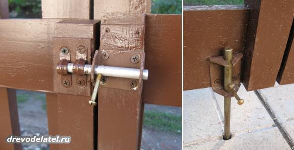 После высыхания краски привинчиваем к створкам запоры (мы с отцом использовали обычные оконные шпингалеты) и один самодельный шпингалет в землю, для удерживания одной створки на месте.
