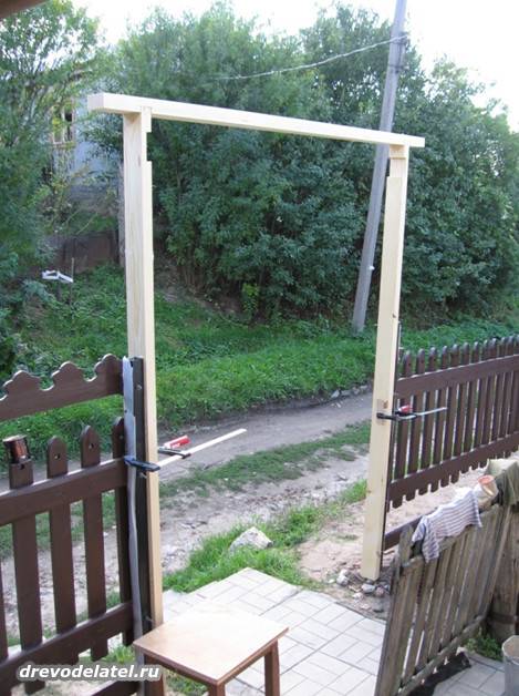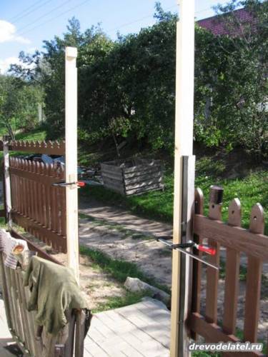 Далее прижимаю стойки к уже вкопанным в землю столбам, пока на струбцинах,