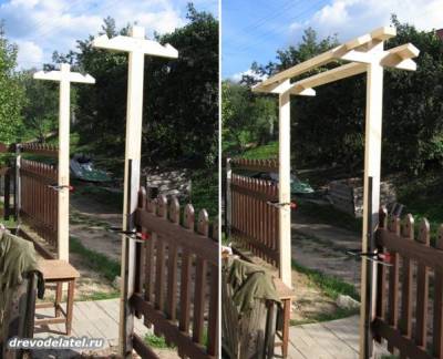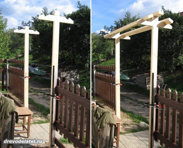 И делаю стойки для навеса, соединяя брусы в крестовину.