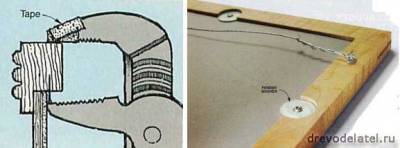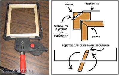 Струбциной можно пользоваться такой, как на фото, а можно использовать самодельные, из деревянных уголков и верёвочки. Самодельный вариант стягивает рамку также надёжно, просто магазинной работать быстрее.