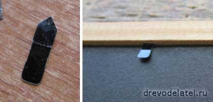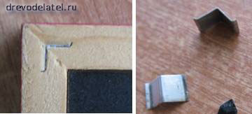 Это самый простой, дешёвый и при этом надёжный способ крепления задника. При более многочисленном изготовлении рамок есть смысл приобрести специальный пистолет-степлер, который вгоняет в рамку вот такие плоские металлические стрелки.