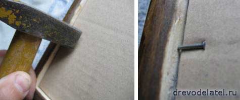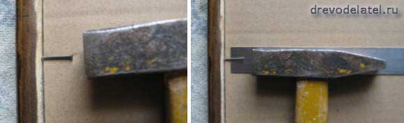 Вначале легонько вбиваю гвоздик в рамку, чтобы зафиксировать его в древесине. Затем подкладываю металлическую линейку под молоток и, елозя бойком по линейке, забиваю гвоздик окончательно. Благодаря линейке боёк молотка не портит картон задника.