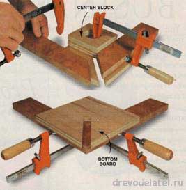 В начале своей древодельной практики я испробовал все способы ручного запиливания «на ус» (это вообще-то самый трудный и ответственный этап в изготовлении рамок) – запиливал багет и в стуслах, и в угловых тисках, и припиливал в самодельных кондукторах (наподобие того, что на картинке ниже);