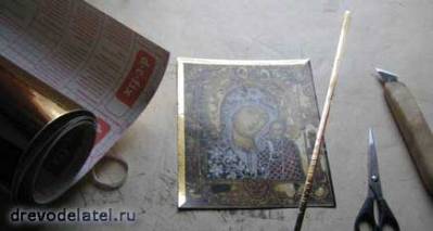 Иконку или картинку можно украсить паспарту либо каймой из золотой самоклейки.