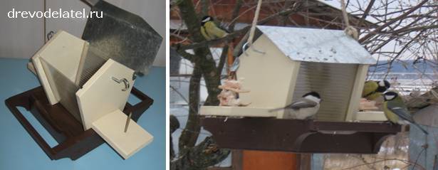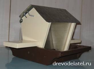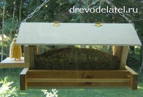 Эта конструкция кормушки очень удачна тем, что можно добавить резьбу, декоративные накладки, и при этом кормушка очень практична и удобна.