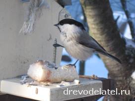 Корм – синички обожают несолёное сало, его хорошо крепить как к самой кормушке на саморезы, так и к веткам вокруг. Сала хватает надолго, синички очень чистоплотны и непрожорливы.