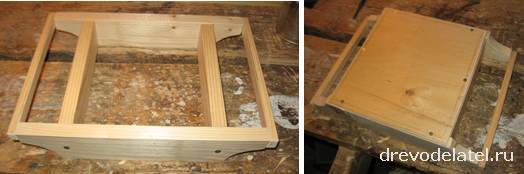 Прикрепляю палочки-жёрдочки к выступам боковин (на них будут сидеть птички), привинчиваю фанерное дно снизу.
