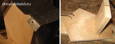 Готовую крышу прикрепляю на болтах к кормушке – красота! ;-) И щели нет, и вечная. Привинчиваю к стенкам крючки для подвески, в площадки ввинчиваю длинные саморезы.