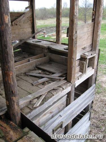 Удобные комфортные стульчаки верхнего этажа вынесены за стену первого этажа туалета. Снаружи всё это было аккуратно обшито вагонкой.