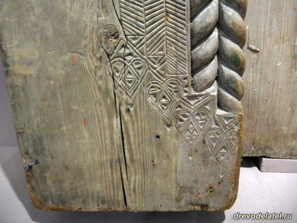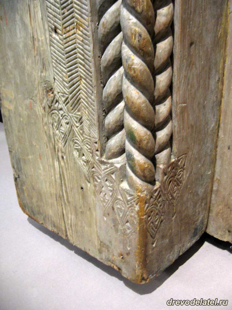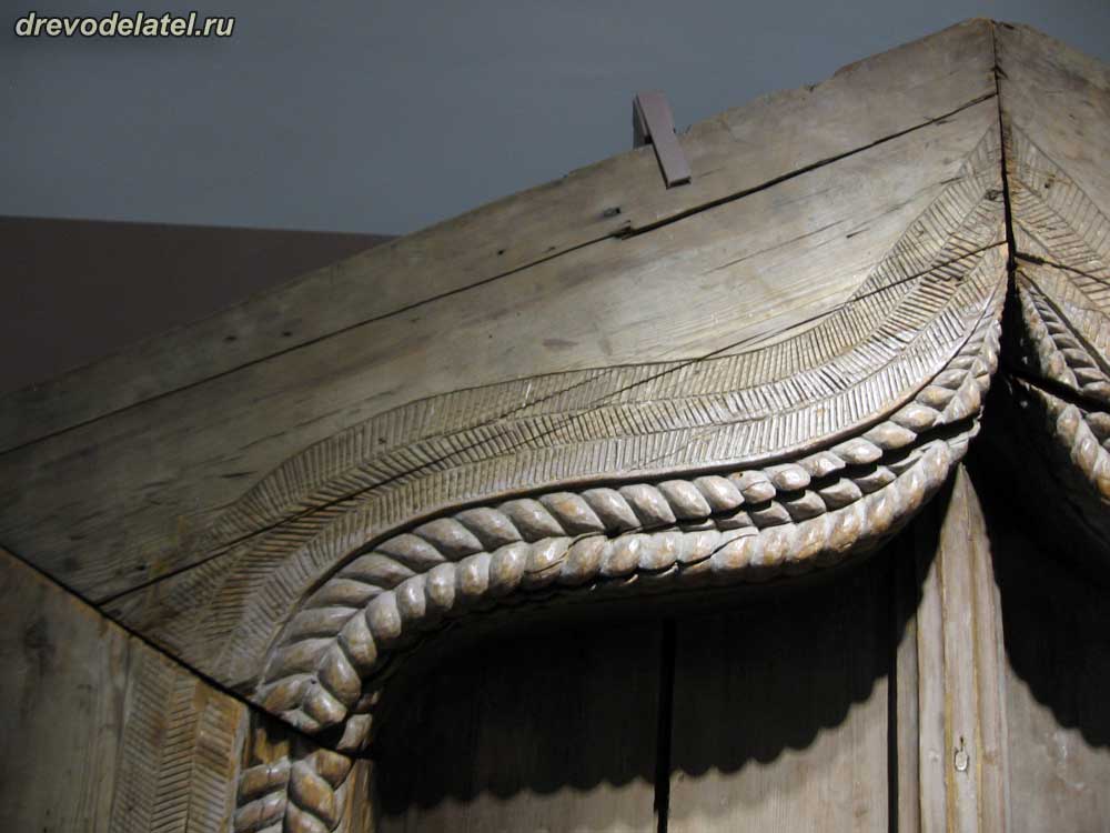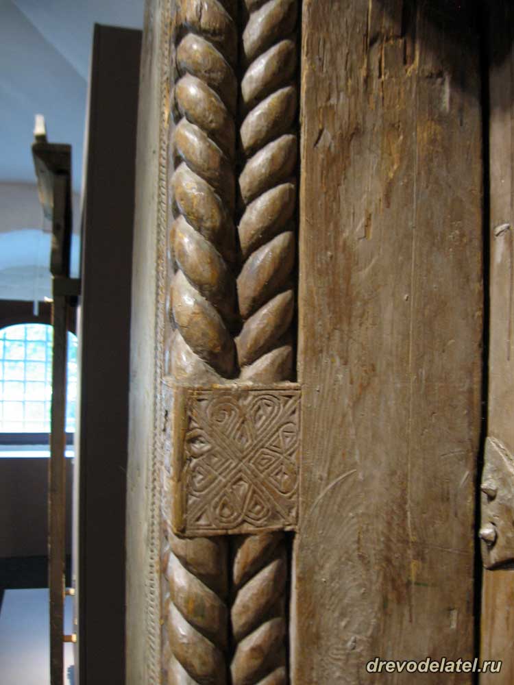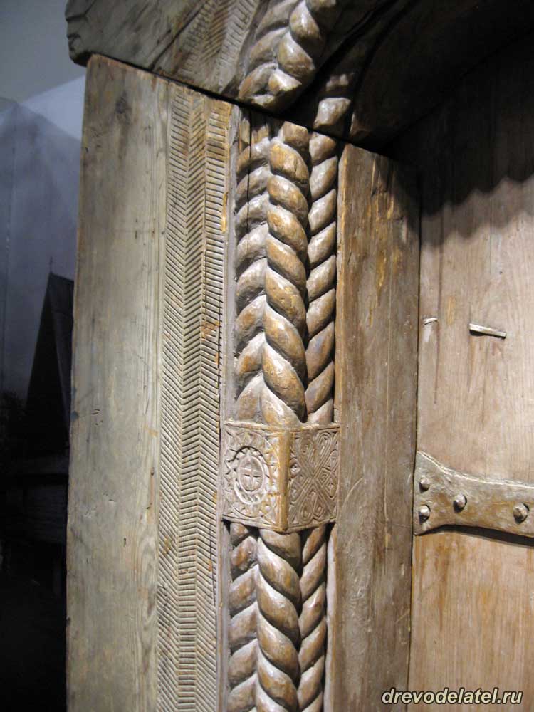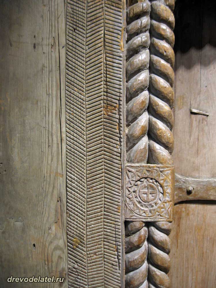 Весь основной декор расположен на колодах двери. Сочетание плоскорельефной и геометрической резьбы создаёт эффектное впечатление.