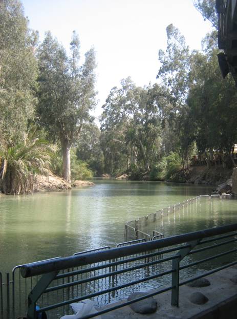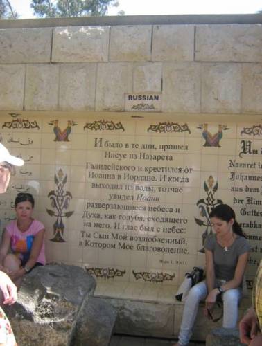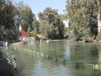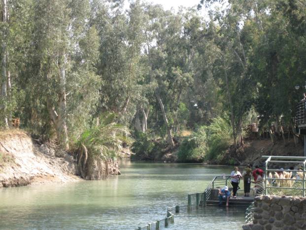 Переодевшись, спустились к воде. Вода очень тёплая, зеленоватого цвета из-за растущего по берегам эвкалипта, течение очень спокойное. Мы по ступенькам погрузились в воды Иордана, в котором принимал крещение от святого Иоанна Предтечи Господь Иисус Христос. Какое блаженство!