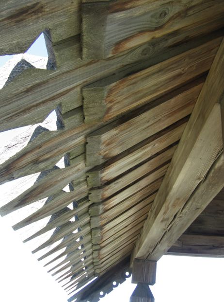 Оказывается, эти нащельники (точнее, подщельники ;-)) установлены под крышей, причём в этих досках выбраны канавки для стока воды. И красиво, и практично! Конечно, в наше время можно и просто постелить рубероид под тёс крыши, но мы-то сейчас говорим об аутентичности, верно? ;-)