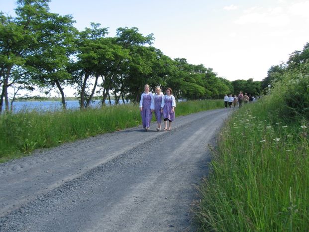 Вот навстречу возвращаются в свою избу ребята из детского лагеря, видно, с какого-то мероприятия, раз в нарядных русских костюмах.