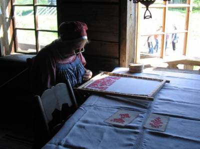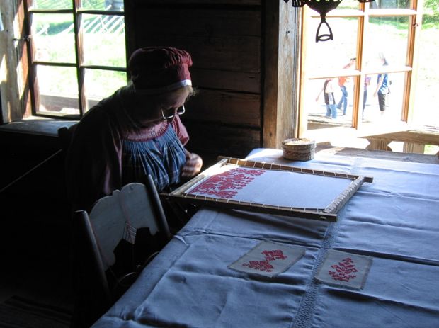 И в других комнатах сидят красавицы-смотрительницы в русских народных костюмах, причём ткут при этом на ткацких старинных станках и вышивают полотенца с древними узорами.