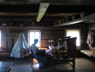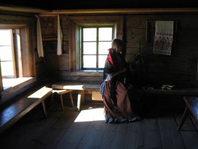 Войдя в избу и перекрестившись на образ, я будто очутился в позапрошлом веке – на лавке сидела девушка в русском народном костюме и пряла веретено.