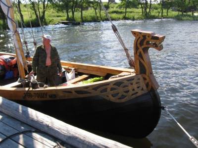Ну а мы, перекусив, идём дальше, на самый дальний край острова. По пути зашли в деревню Ямка, чтобы ещё раз полюбоваться на старинные дома, и как раз увидели у пристани причалившуюся ладью, с резным носом-головой дракона и парусами!